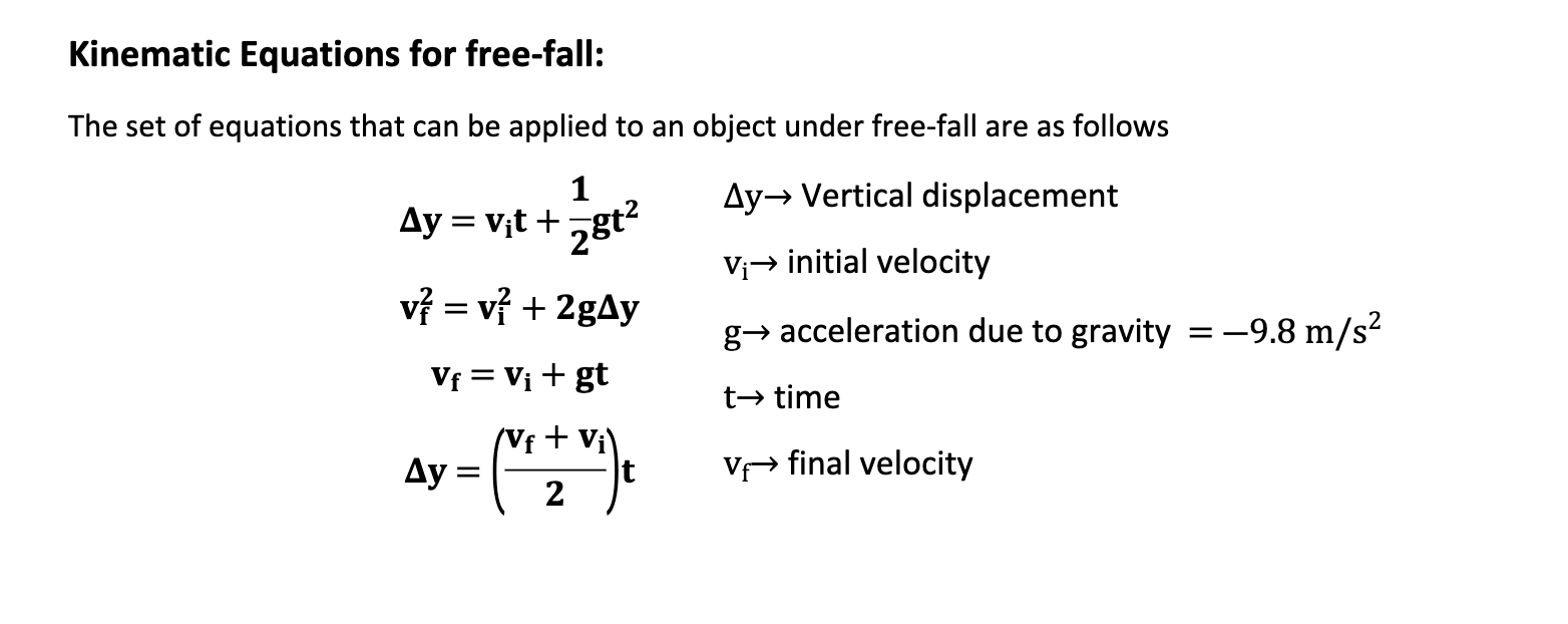 Kinematic Equations for Objects in Free Fall We assume here that acceleration equals g with the positive direction upward. V v 0 g t v v 0 g t. Imagine an object body is falling freely for time t seconds with.